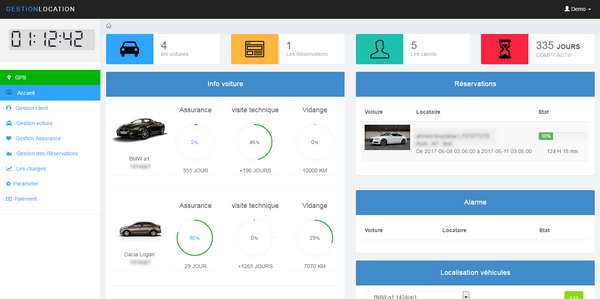 La page d’accueil vous informer les détails précis tel que le nombre des clients, de voitures et de réservations actuels. Diagramme qui montre le reste d’assurance et la visite technique et vidange pour chaque voiture. Recevoir de Rappel de réservations de véhicules sortis et le temps resté pour revenir.