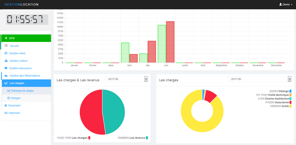 La page des charges vous permet d’afficher des diagrammes des charges de l’entreprise. vidange assurance visite technique Chaine distribution et d'autre charges Les revenus de location organisée par les dates.