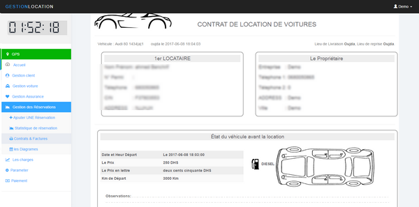 La Gestion de réservations vous pouvez ajouter facilement une réservation ou imprimer le contrat ou la facture ainsi une option importer les images de l’état de véhicule avant et après de location .